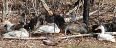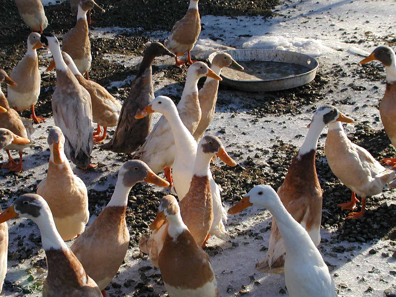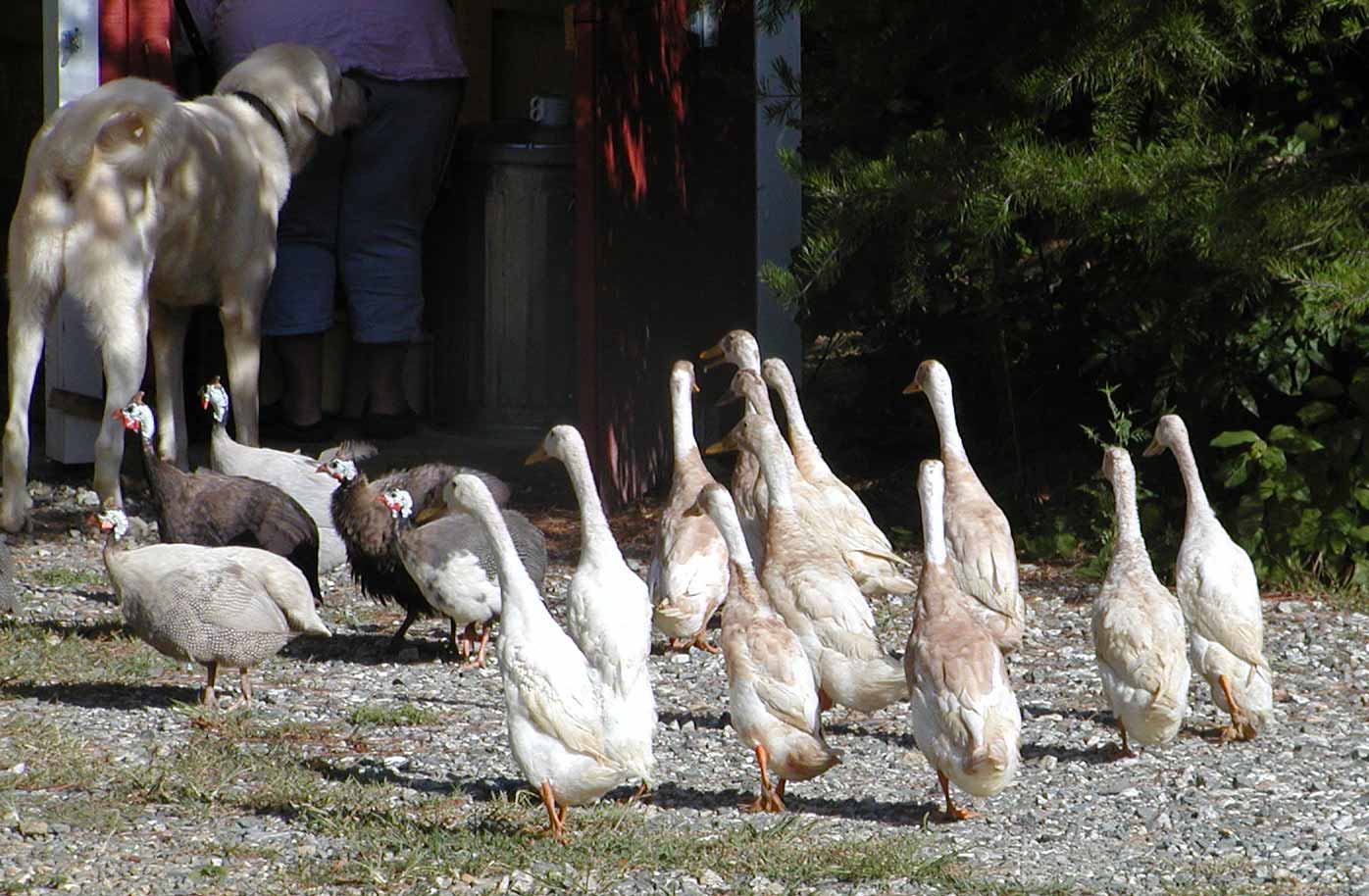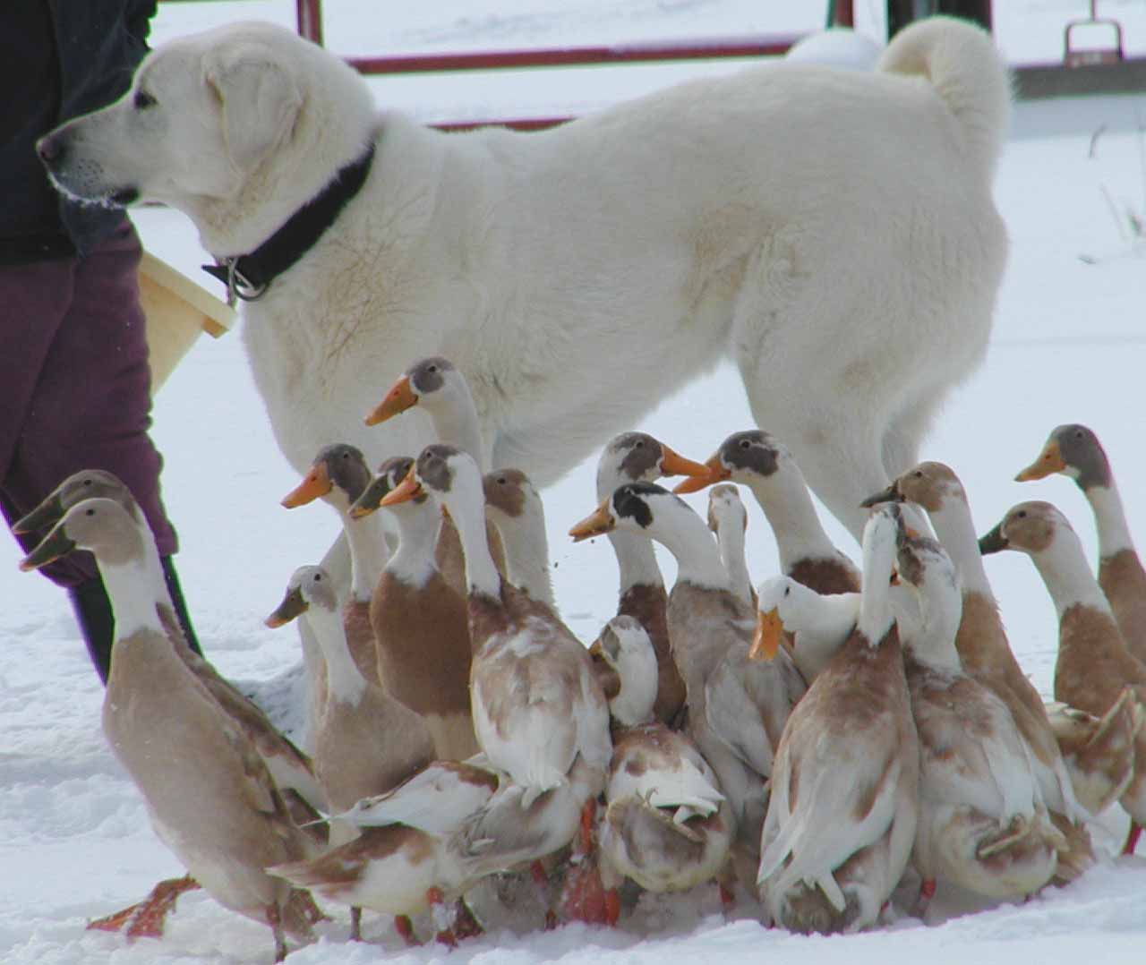 We don't get snow often so they are not used to it. Here they are waiting for breakfast seeking shelter under the dog. This shows how well our Akbash dog works with the ducks who are completely comfortable around him. |