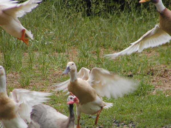 Runners aren't fully flighted. Nice so they won't fly over and settle on your neighbor's pond but it does leave them a little more vunerable to land predators. They can get airborne though if they get a running start and can go a fair way if the wind and terrain are just right. |