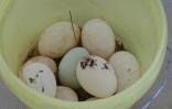 Since our ducks spend the nights outdoors, they lay their eggs where they are. Often that makes for muddy eggs. Most of our ducks lay white eggs but we do have one that lays a very pretty blue shelled egg. The eggs have a rich, mild flavor. |